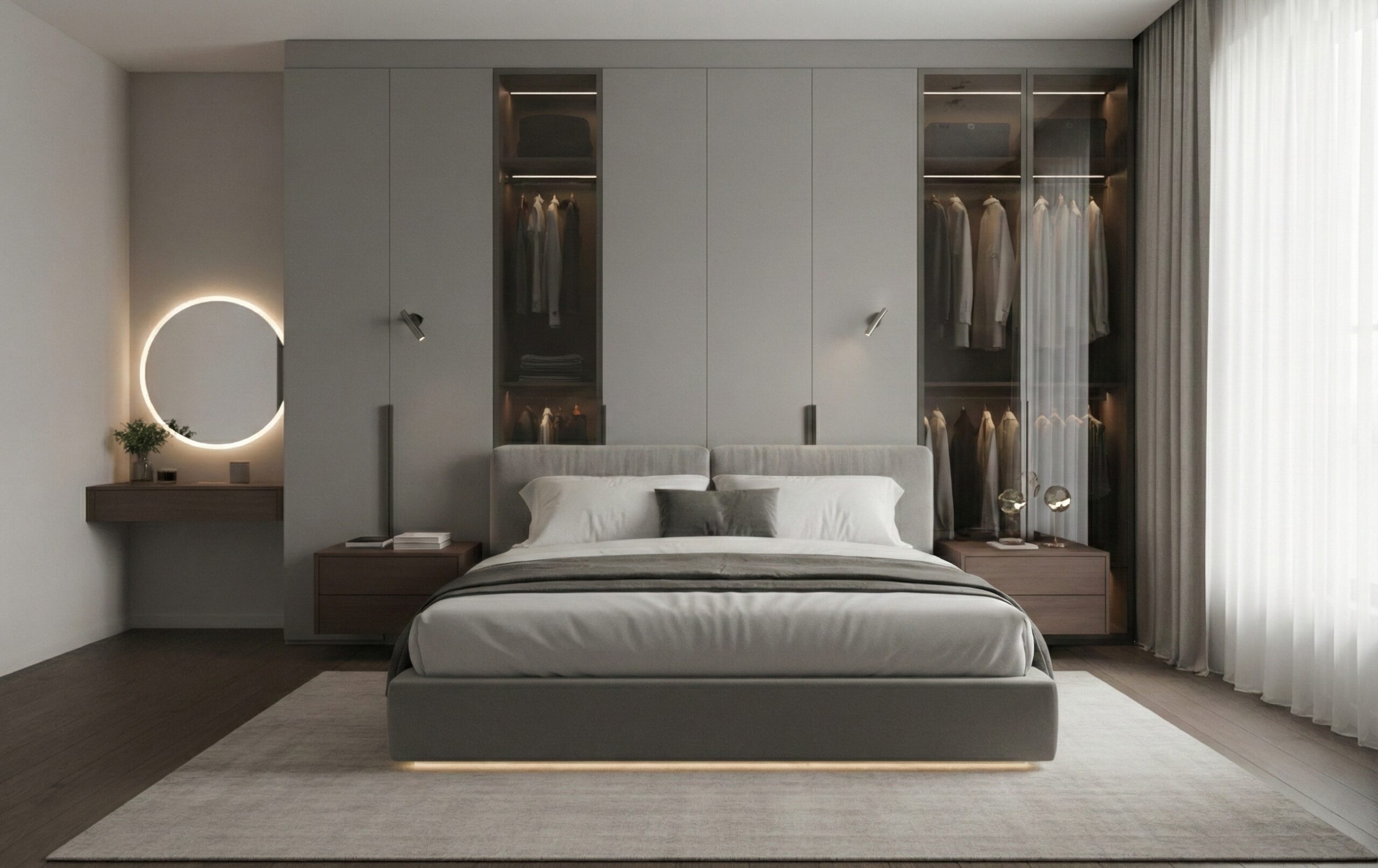 Mise en scène : Grands miroirs toute hauteur, éclairages LED intégrés et cintres coordonnés transforment un simple meuble en un ensemble architectural cohérent.