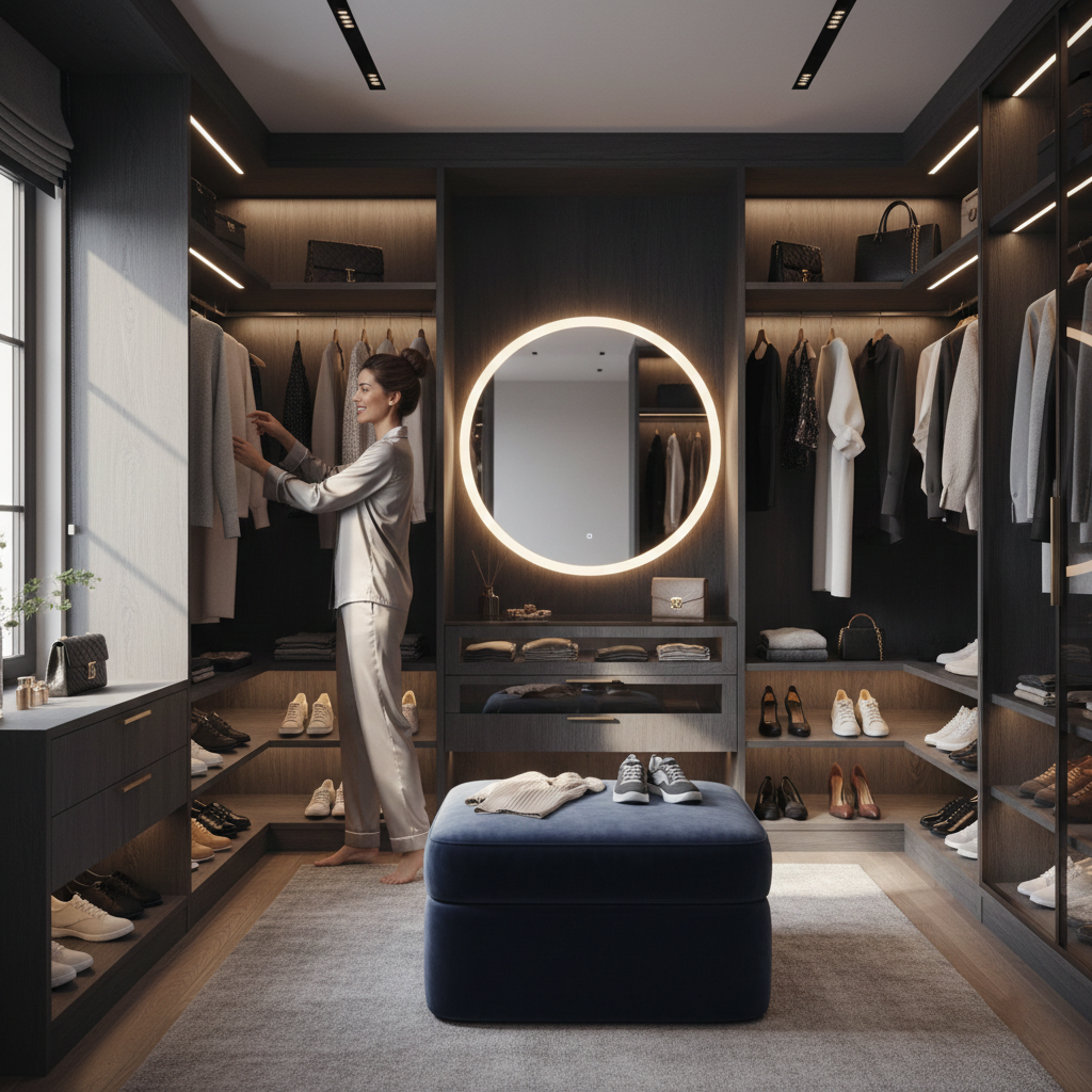 L’éclairage est crucial. Nous proposons l’intégration de profilés LED encastrés avec détecteurs de mouvement. Cela permet de distinguer les couleurs de vos vêtements sans avoir besoin d’allumer la lumière principale de la pièce.