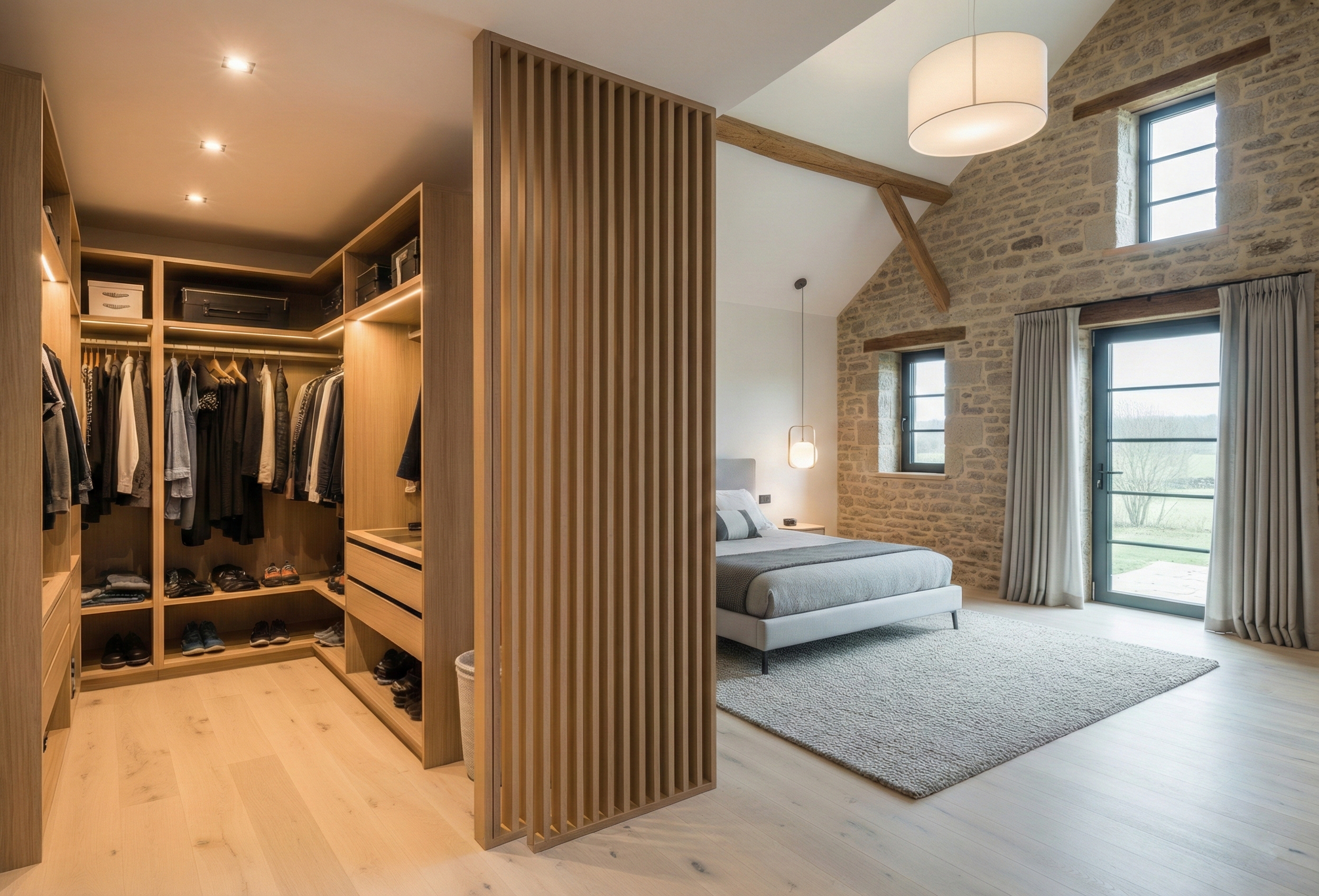 Le souci du détail : Portes coulissantes minimalistes, finitions en bois noble, éclairage LED intégré ou poignées artisanales… chaque choix transforme votre rangement en une pièce maîtresse de votre décoration.